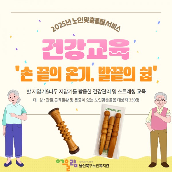 저희 노인맞춤돌봄서비스팀에서는 관절·근육 질환 및 통증이 있는 어르신 350명을 대상으로 발 지압기와 나무 지압기를 활용한 건강관리 및 스트레칭 교육을 진행했습니다.