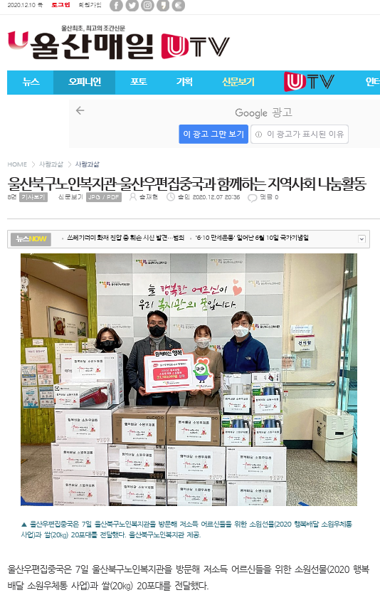 [울산매일신문]울산북구노인복지관-울산우편집중국과 함께하는 지역사회 나눔활동(2020.12.07) 페이지 정보 작성자 silver 작성일20-12-10 10:54 조회1,338회 댓글0건 관련링크 목록 본문 http://www.iusm.co.kr/news/articleView.html?idxno=894786 목록